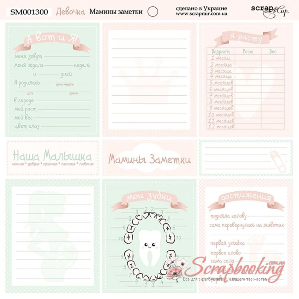 Двосторонній аркуш паперу 20*20см із колекції Мамині Нотатки Дівчинка виробника Scrapmir з картками для вирізування щільністю 190гр/м2. Використовується для виготовлення альбомів, аркушівок, подарункових коробочок. Архівна якість