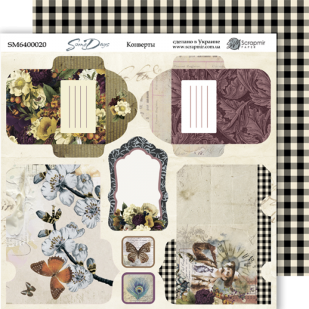 Двосторонній аркуш паперу 20*20см щільністю 190гр/м2 Конверти із колекції Some days від виробника Scrapmir. Використовується для виготовлення альбомів, аркушівок, подарункових коробочок. Архівна якість