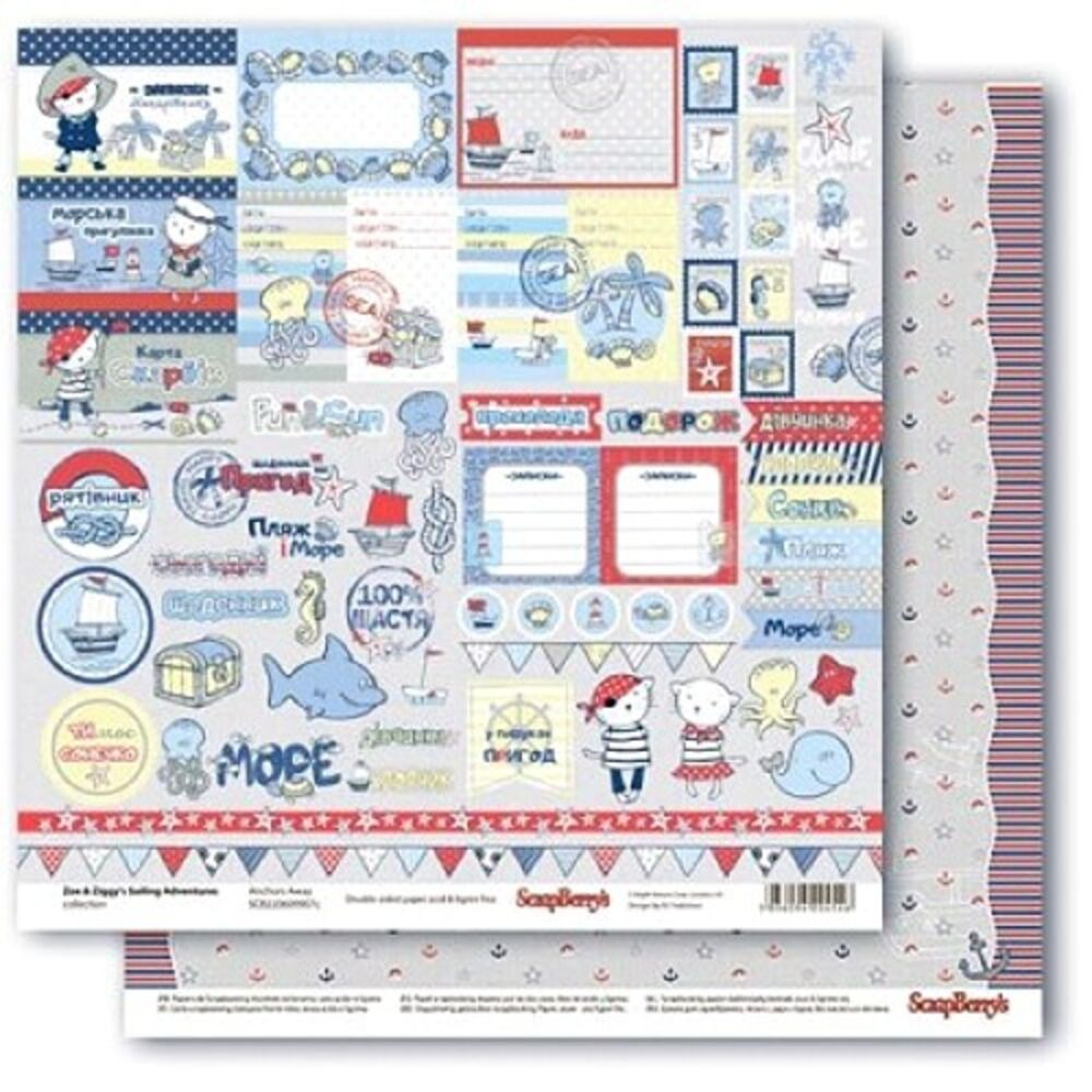 Двосторонній аркуш паперу 30*30см щільністю 180гр/м2 із колекції Морські пригоди від виробника ScrapBerry's. Подорож двох маленьких мишенят піратів Зої та Зіги морськими просторами. Картки з елементами. Написи українською. З цього паперу вийдуть чудові тематичні аркушівки, дитячі морські тревели буки, альбоми. Архівна якість.