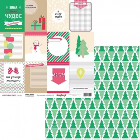 Двосторонній аркуш паперу 30*30см щільністю 180гр/м2 із колекції Зимові канікули від виробника ScrapBerry's. Новий рік в американському стилі та незвичайному кольоровому рішенні, червоний, зелений, жовтий та трендовий крафт. Тема зимового відпочинку, велика кількість написів російською мовою. Архівна якість