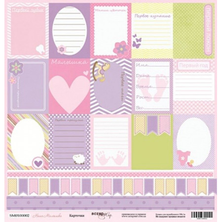 Односторонній аркуш паперу 30*30см щільністю 190гр/м2 із колекції Наша Малишка від виробника Scrapmir. Папір в американському стилі, ніжний та яскравий, з милими візерунками для дитячих альбомів, аркушівок та інших робіт для ваших малюків. Архівна якість