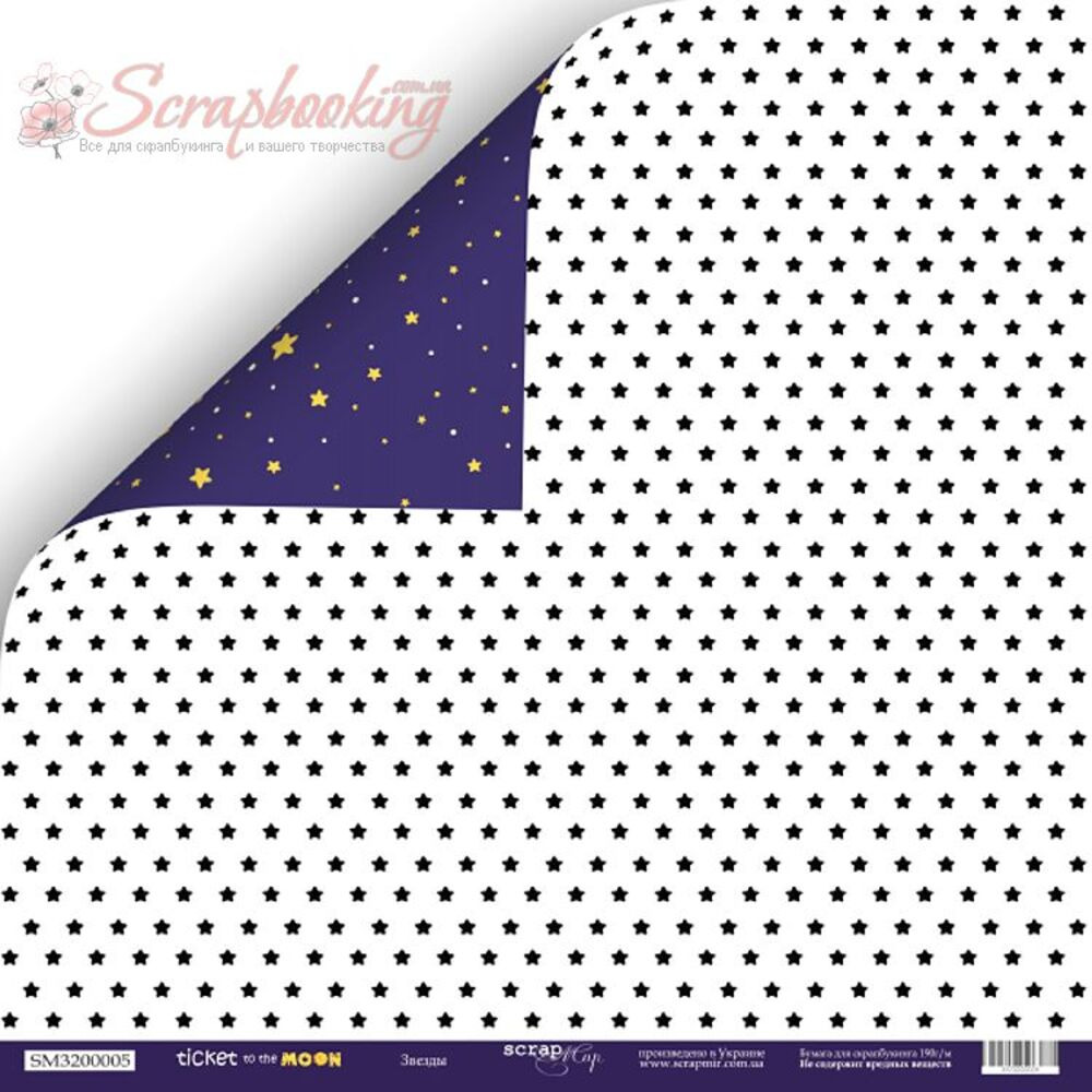 Двосторонній аркуш паперу 30*30см щільністю 190гр/м2 Зірки з колекції Ticket to the Moon від виробника Scrapmir. Використовується для виготовлення альбомів, аркушівок, подарункових коробочок. Архівна якість