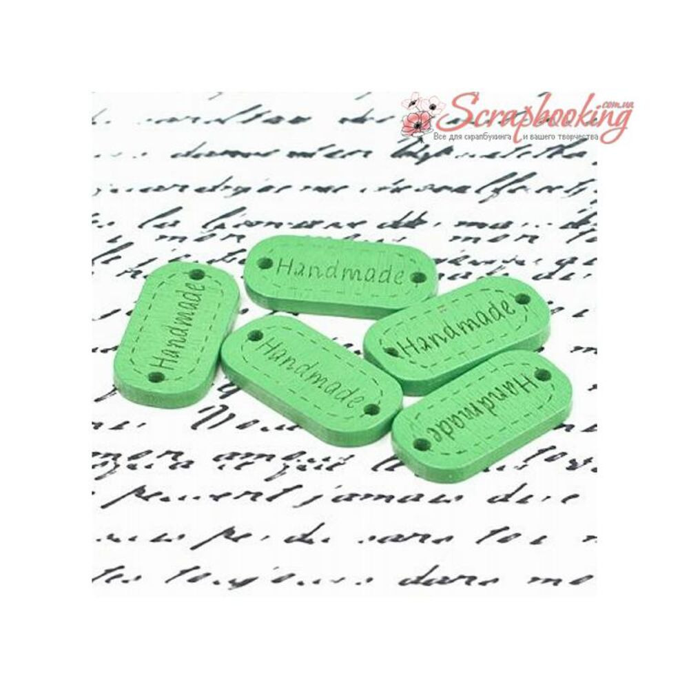 Дерев'яна бирка з написом "Hand made" розміром 24*12мм. Є отвори для пришивання.