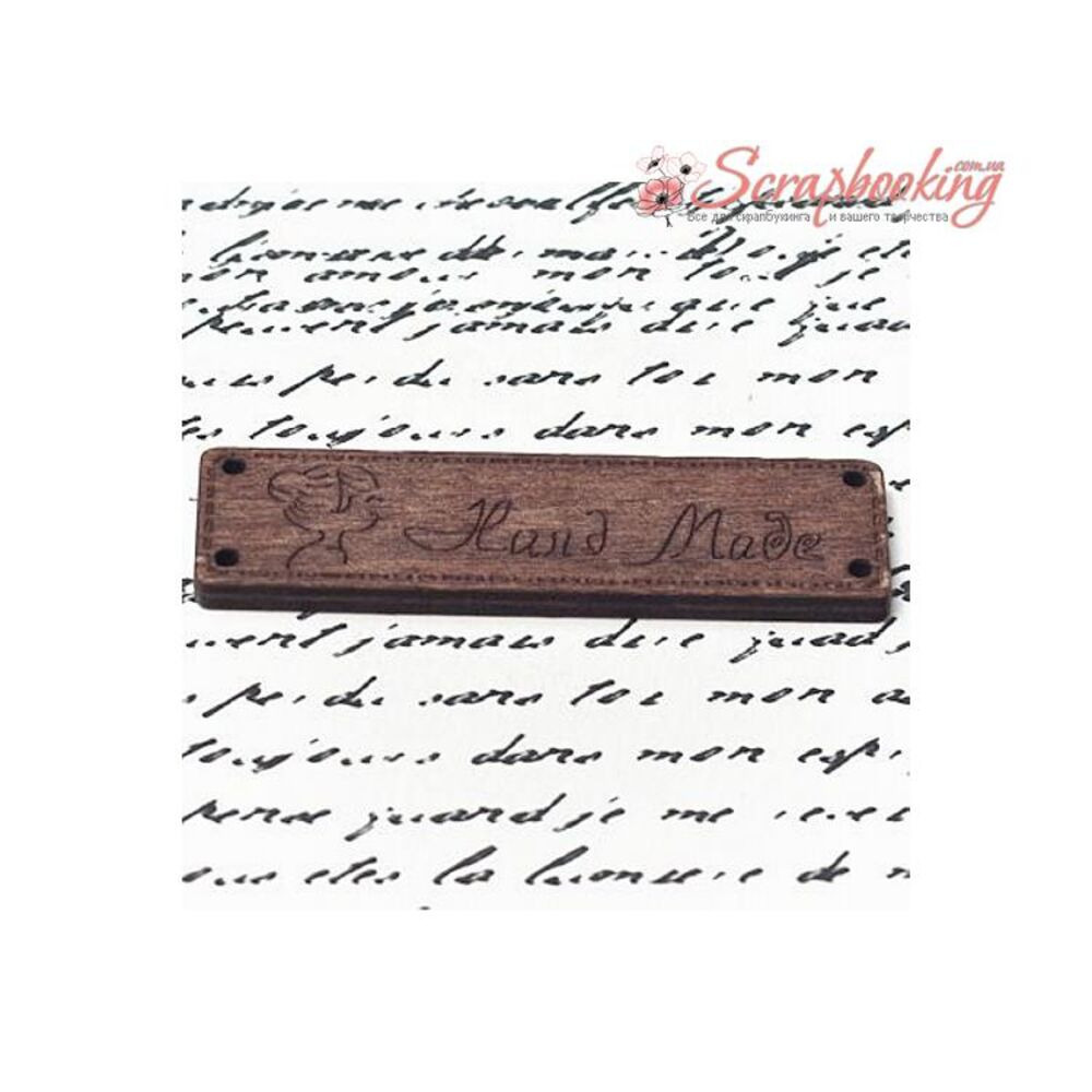Дерев'яна бирка з написом "Hand made" розміром 64*17мм. Є отвори для пришивання.