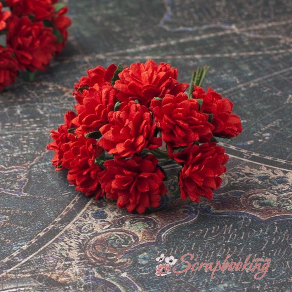 Букет декоративних мініатюрних астр ручної роботи червоного кольору. У букеті 10 бутонів айстр діаметром 15мм. Довжина стебла 4см.