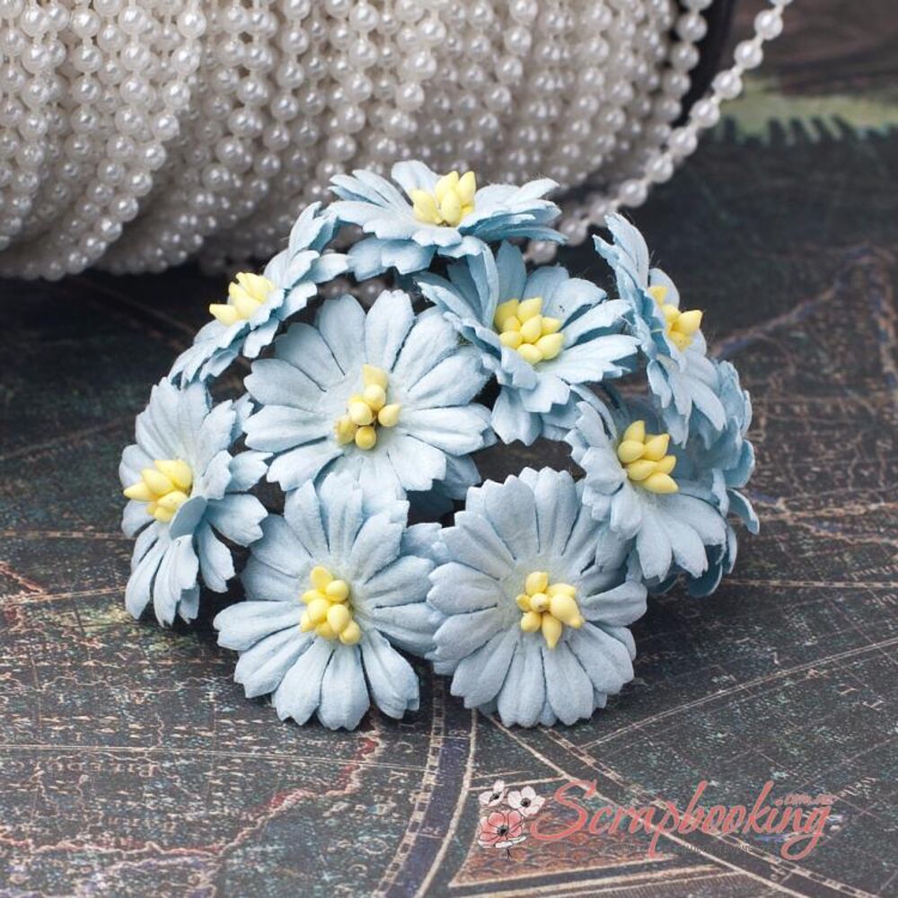 Букет паперових декоративних гвоздичок ручної роботи блакитного кольору. У букеті 10 бутонів гвоздичок діаметром 25мм. Довжина стебла 7...8см.