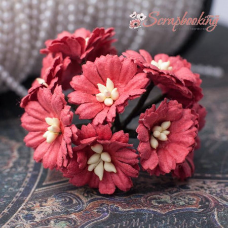 Букет паперових декоративних гвоздичок ручної роботи коралового кольору. У букеті 10 бутонів гвоздичок діаметром 25мм. Довжина стебла 7...8см.