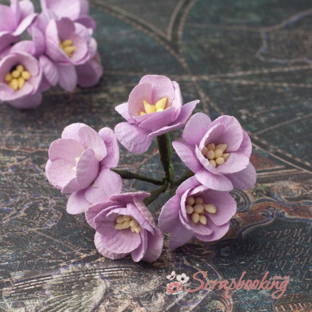 Букет паперових декоративних квітів вишні ручної роботи світло-фіолетового кольору. У букеті 5 бутонів квітів вишні діаметром 25мм. Довжина стебла 8см.