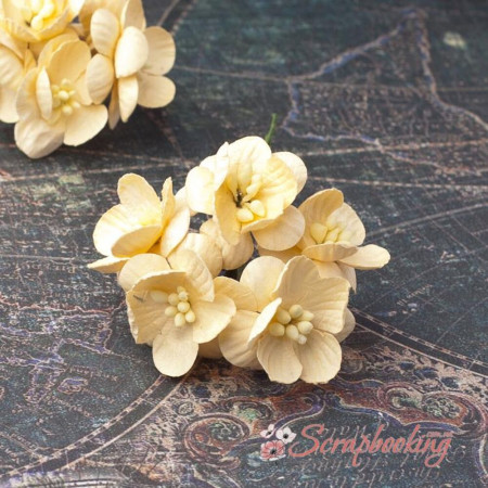 Букет паперових декоративних квітів вишні ручної роботи кремового кольору. У букеті 5 бутонів квітів вишні діаметром 25мм. Довжина стебла 8см.