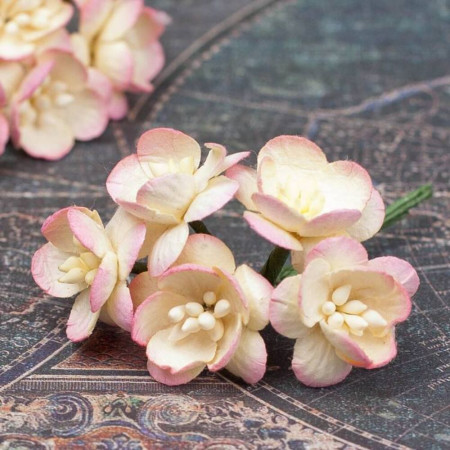 Букет паперових декоративних квітів вишні ручної роботи рожево-кремового кольору. У букеті 5 бутонів квітів вишні діаметром 25мм. Довжина стебла 8см.