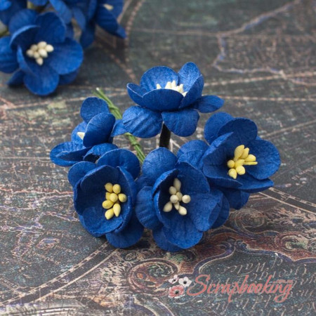 Букет паперових декоративних квітів вишні ручної роботи волошкового кольору. У букеті 5 бутонів квітів вишні діаметром 25мм. Довжина стебла 8см.