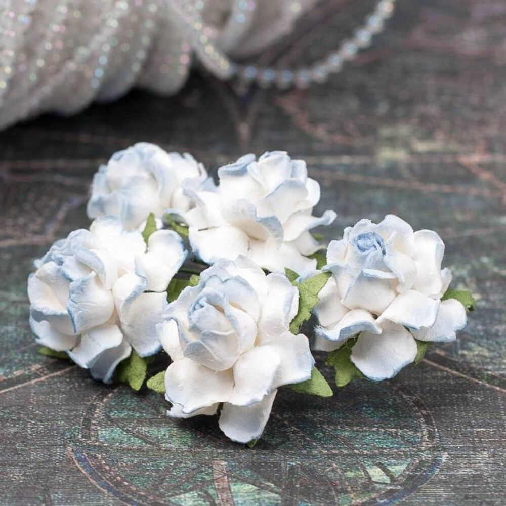 Букет бумажных роз ручной работы бело-голубого цвета. В букете 5 бутонов роз диаметром 25мм. Длина стебля 6см.