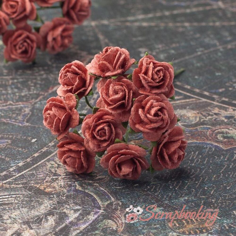 Букет бумажных розочек ручной работы красно-коричневого цвета. В букете 10 бутонов роз диаметром 10мм. Длина стебля 6...7см.