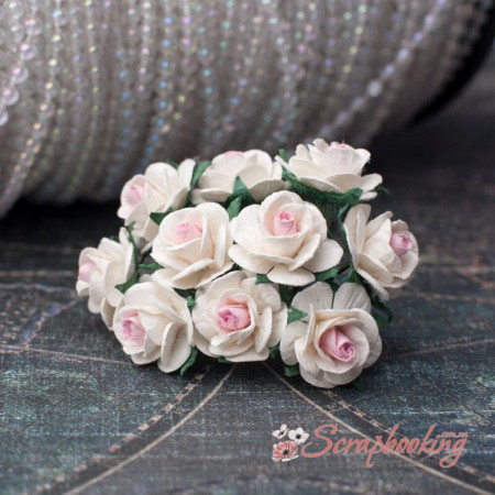 Букет бумажных розочек ручной работы бело-розового цвета. В букете 10 бутонов роз диаметром 15мм. Длина стебля 6...7см.