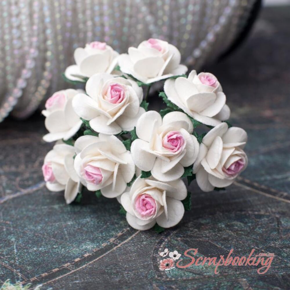 Букет бумажных розочек ручной работы бело-розового цвета. В букете 10 бутонов роз диаметром 20мм. Длина стебля 6...7см.