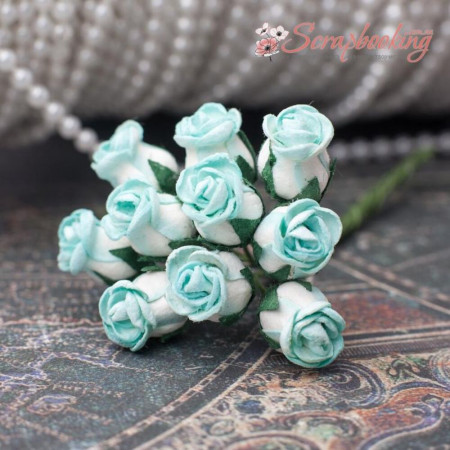 Букет бумажных роз ручной работы нежного цвета аквамарин. В букете 10 бутонов роз диаметром 10мм. Длина стебля 8см.