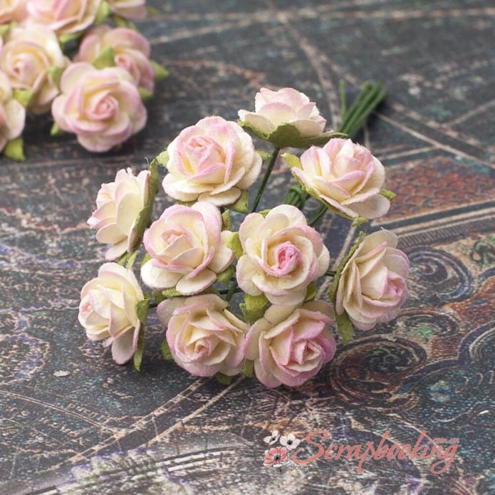 Букет паперових троянд ручної роботи кремово-рожевого кольору. У букеті 10 бутонів троянд діаметром 10мм. Довжина стебла 6...7см.