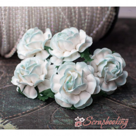 Букет паперових чайних троянд ручної роботи біло-ментолового кольору. У букеті 5 бутонів троянд діаметром 40мм. Довжина стебла 6см.
