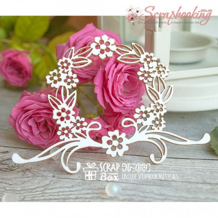 Декоративний чіпборд віночок із квітами розміром 100*70мм виробника Scrapbox виготовлений із пивного картону білого кольору. Товщина картону 2мм. Елементи виготовлені за допомогою лазерного різання. Чіпборди широко застосовуються в скрапбуку як декоративні елементи, які можна оформляти будь-якими способами: декупаж, штампінг, кракелюр, емброссинг та багато іншого.