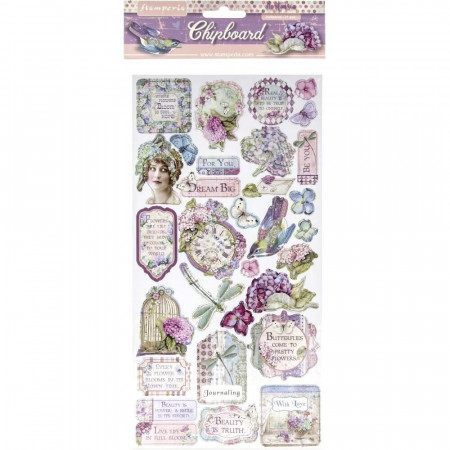 Чипборд із колекції Hortensia виробника Stamperia. На листі розміром 15*30см розташовано 31 чіпборд різноманітної форми на клейовій основі. Архівна якість.