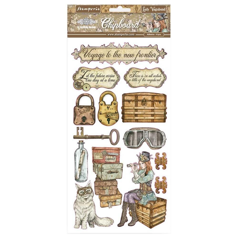 Чіпборд із колекції Lady Vagabond виробника Stamperia. На листі розміром 15*30см розташовано 17 чіпбордів різноманітної форми на клейовій основі. Архівна якість.