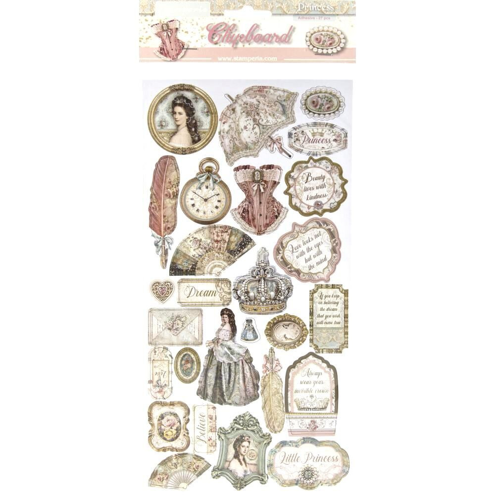 Чипборд из коллекции Princess производителя Stamperia. На листе размером 15*30см расположено 27 чипбордов разнообразной формы на клеевой основе. Архивное качество.
