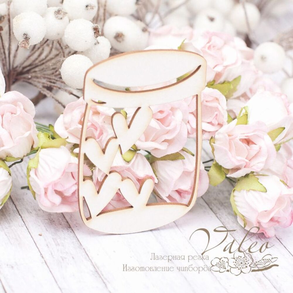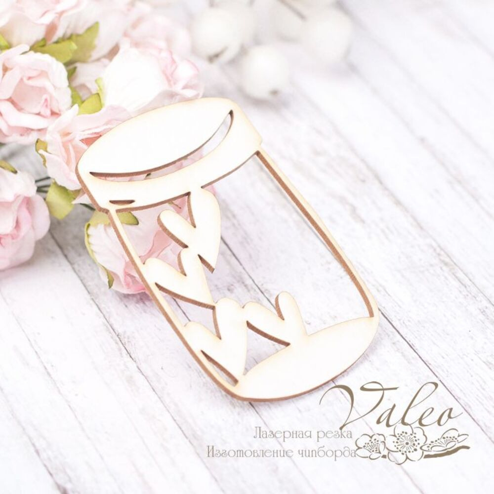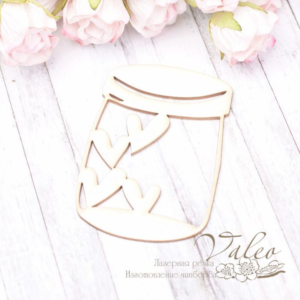 Чіпборд Valeo Баночка із сердечками 45*67мм V2017 виготовлений із пивного картону молочного кольору. Товщина картону 1,5 мм. Краї чисті, світло-коричневі. Застосовується як декоративні елементи при виготовленні альбомів, листівок, запрошень