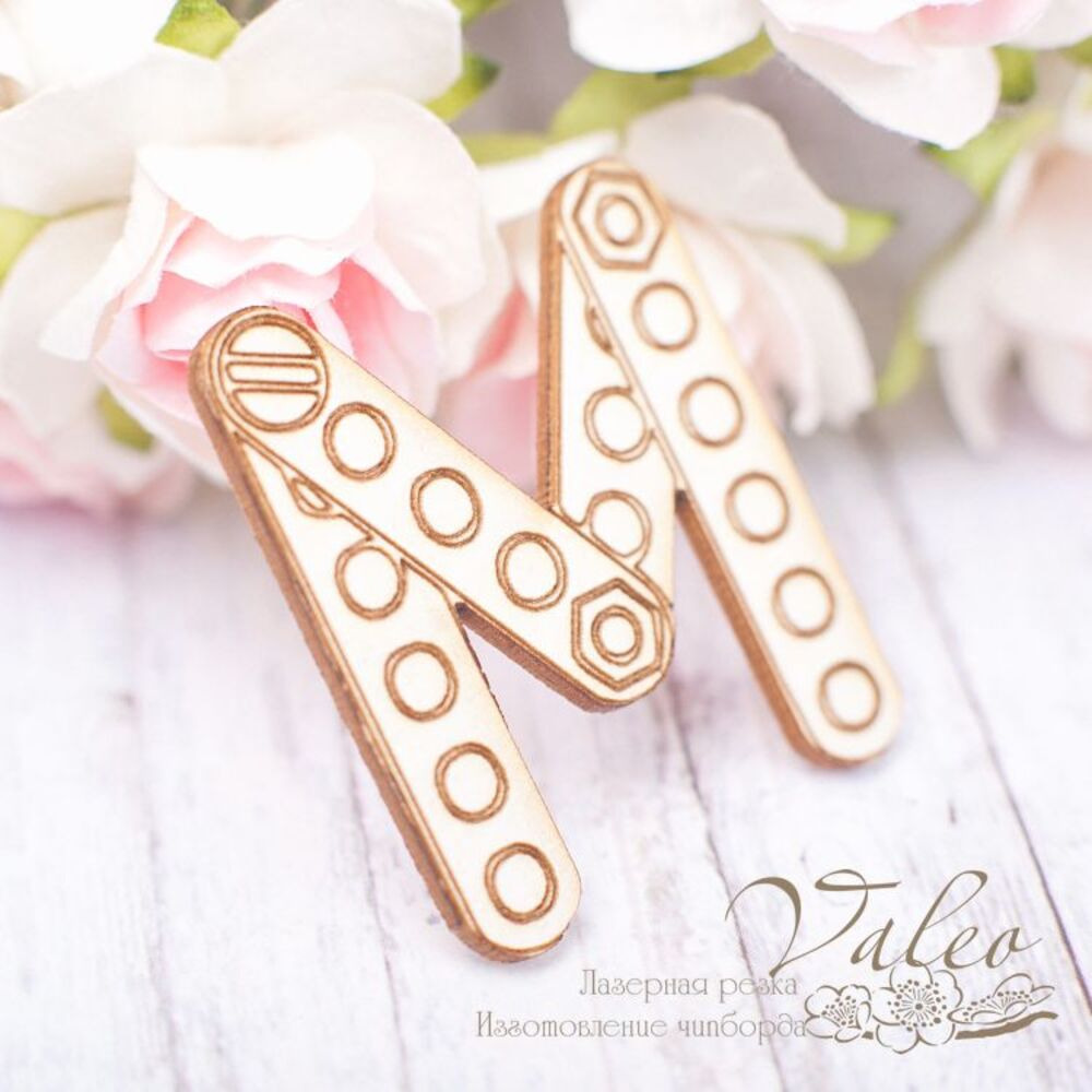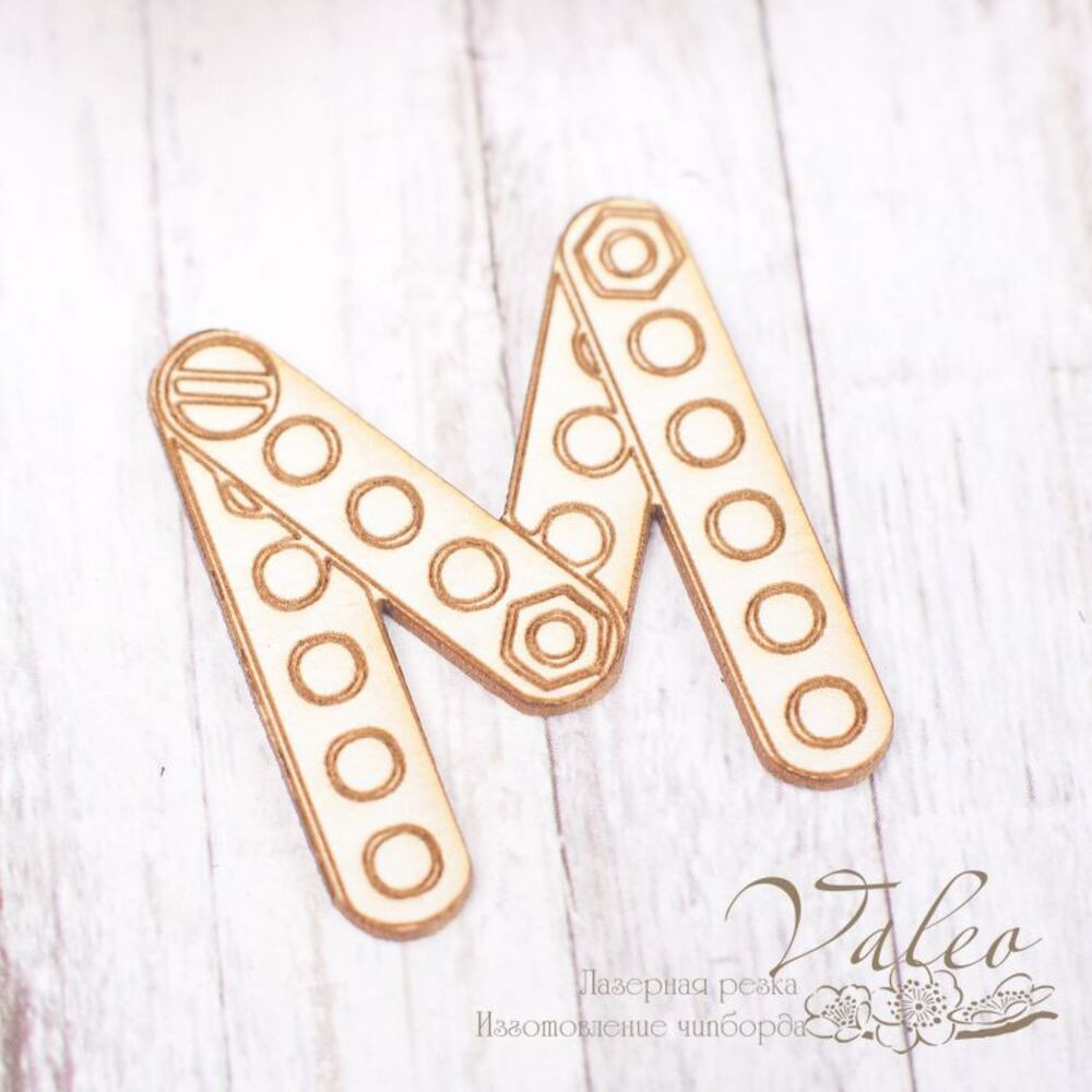 Чипборд Valeo Буква М 28*34мм V1814 изготовлен из пивного картона молочного цвета. Толщина картона 1,5мм. Края чистые, светло коричневые. Применяется в качестве декоративных элементов при изготовлении альбомов, открыток, пригласительных