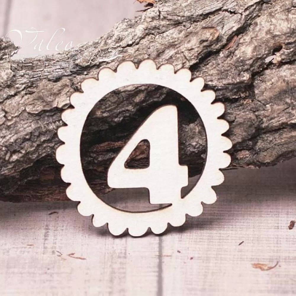 Чіпборд Valeo Цифра у колі 4 40*40мм V1136 виготовлений із пивного картону молочного кольору. Товщина картону 1,5 мм. Краї чисті, світло-коричневі. Застосовується як декоративні елементи при виготовленні альбомів, листівок, запрошення