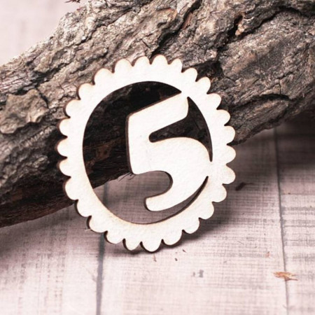 Чіпборд Valeo Цифра у колі 5 40*40мм V1137 виготовлений із пивного картону молочного кольору. Товщина картону 1,5 мм. Краї чисті, світло-коричневі. Застосовується як декоративні елементи при виготовленні альбомів, листівок, запрошення