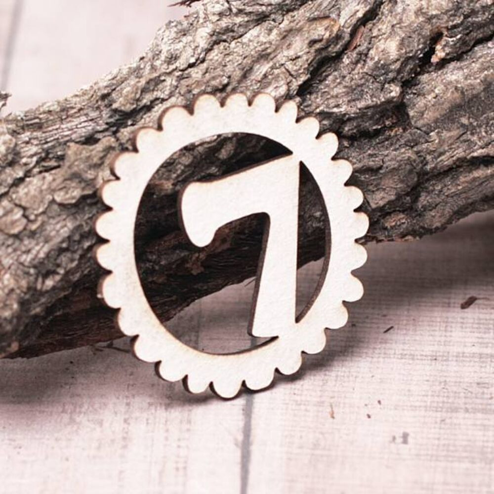 Чіпборд Valeo Цифра у колі 7 40*40мм V1139 виготовлений із пивного картону молочного кольору. Товщина картону 1,5 мм. Краї чисті, світло-коричневі. Застосовується як декоративні елементи при виготовленні альбомів, листівок, запрошення