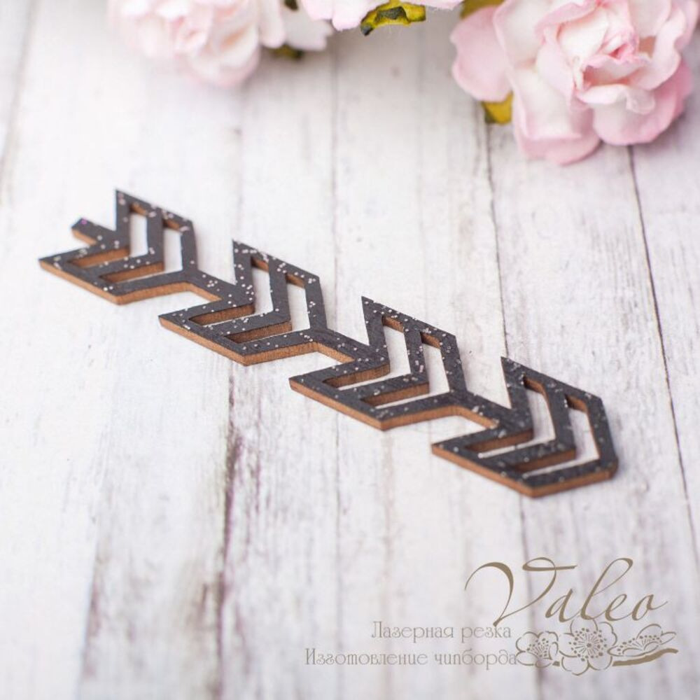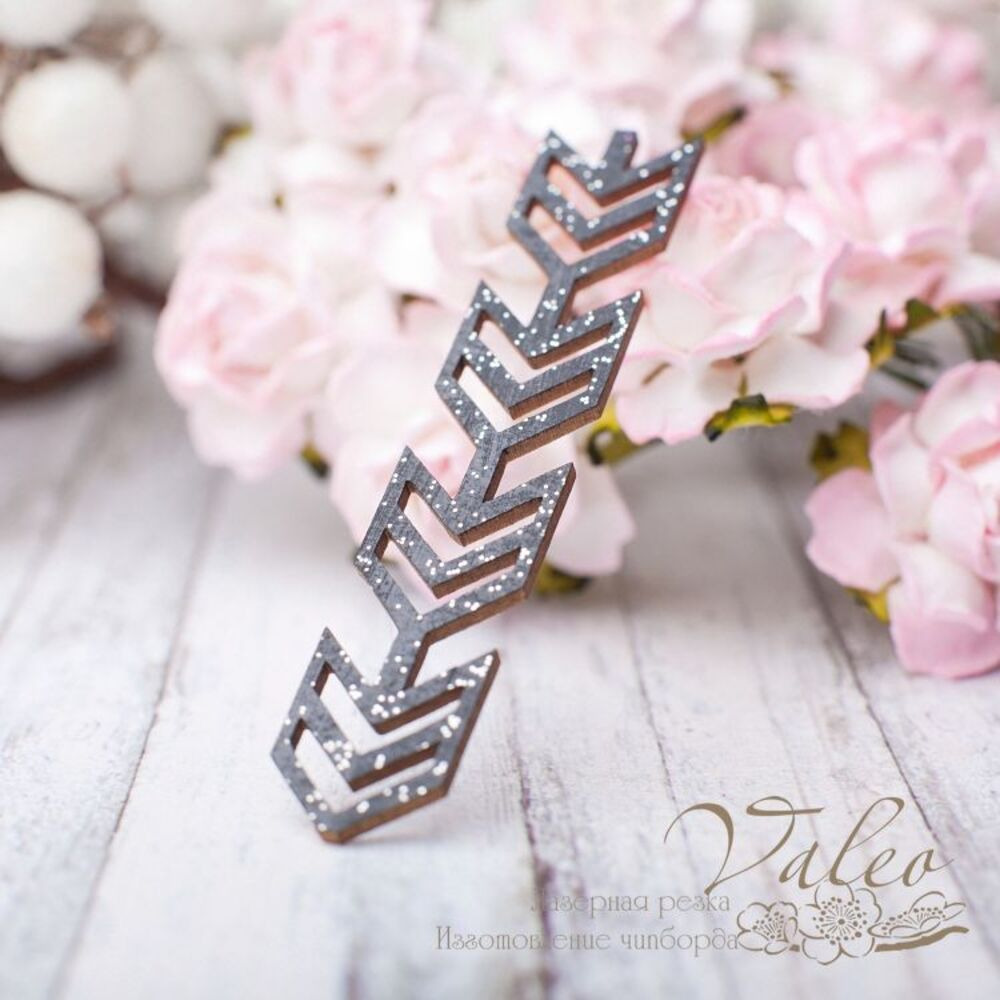 Чипборд Valeo Стрелки 67*13мм черный с глиттером V2643 изготовлен из пивного картона молочного цвета. Толщина картона 1,5мм. Края чистые, светло коричневые. Применяется в качестве декоративных элементов при изготовлении альбомов, открыток, пригласительных