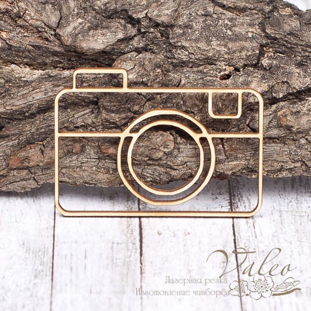 Чіпборд Valeo Фотоапарат 44*31мм V1486 виготовлений із пивного картону молочного кольору. Товщина картону 1,5 мм. Краї чисті, світло-коричневі. Застосовується як декоративні елементи при виготовленні альбомів, листівок, запрошень