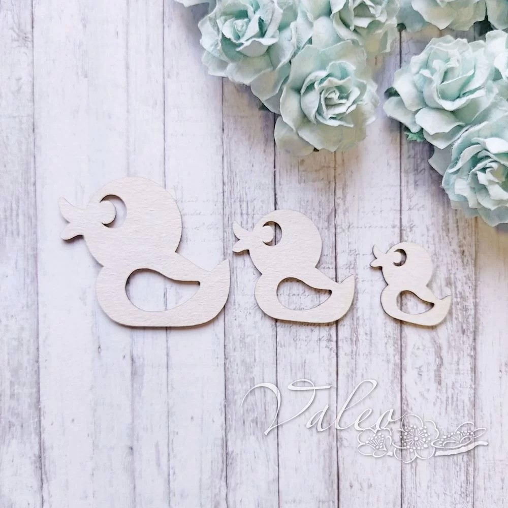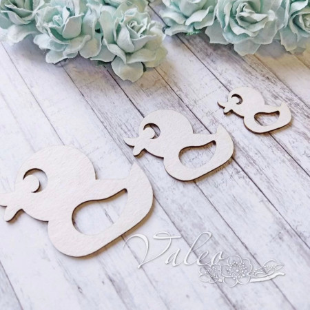 Чіпборд Valeo Качечки 3шт50*43мм 37*33мм 26*23мм V10548 виготовлений із пивного картону молочного кольору. Товщина картону 1,5 мм. Краї чисті, світло-коричневі. Застосовується як декоративні елементи при виготовленні альбомів, листівок, запрошень