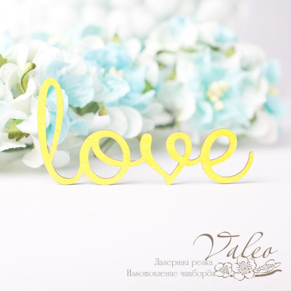Чіпборд Valeo кольоровий Love 59*29мм жовтий із глітером V2678 виготовлений із пивного картону молочного кольору. Товщина картону 1,5 мм. Краї чисті, світло-коричневі. Застосовується як декоративні елементи при виготовленні альбомів, листівок, запрошень
