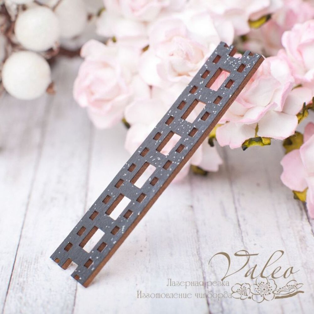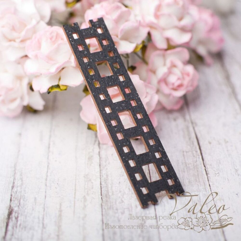 Чіпборд Valeo Плівка 65*15мм чорний із гліттером V2636 виготовлений із пивного картону молочного кольору. Товщина картону 1,5 мм. Краї чисті, світло-коричневі. Застосовується як декоративні елементи при виготовленні альбомів, листівок, запрошень