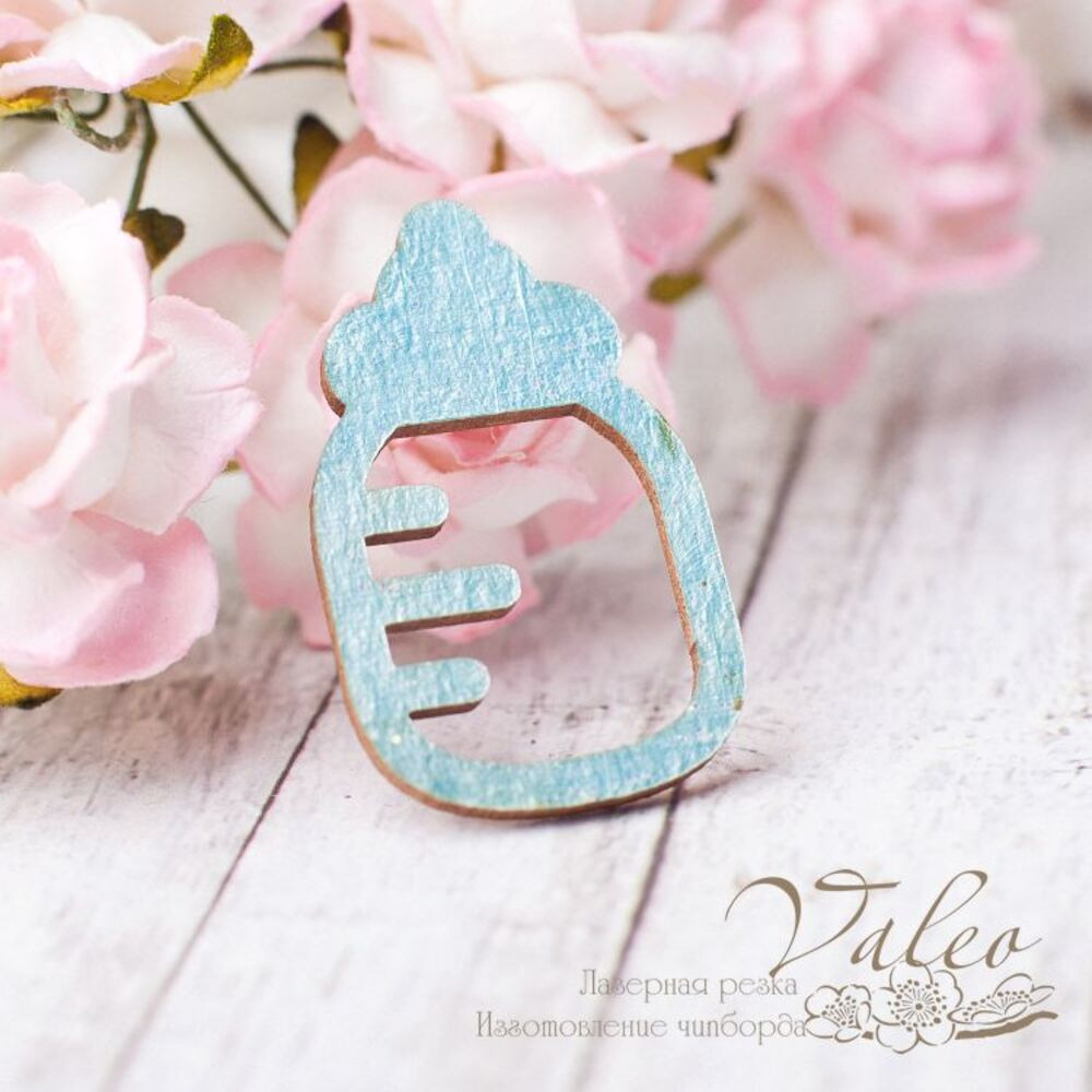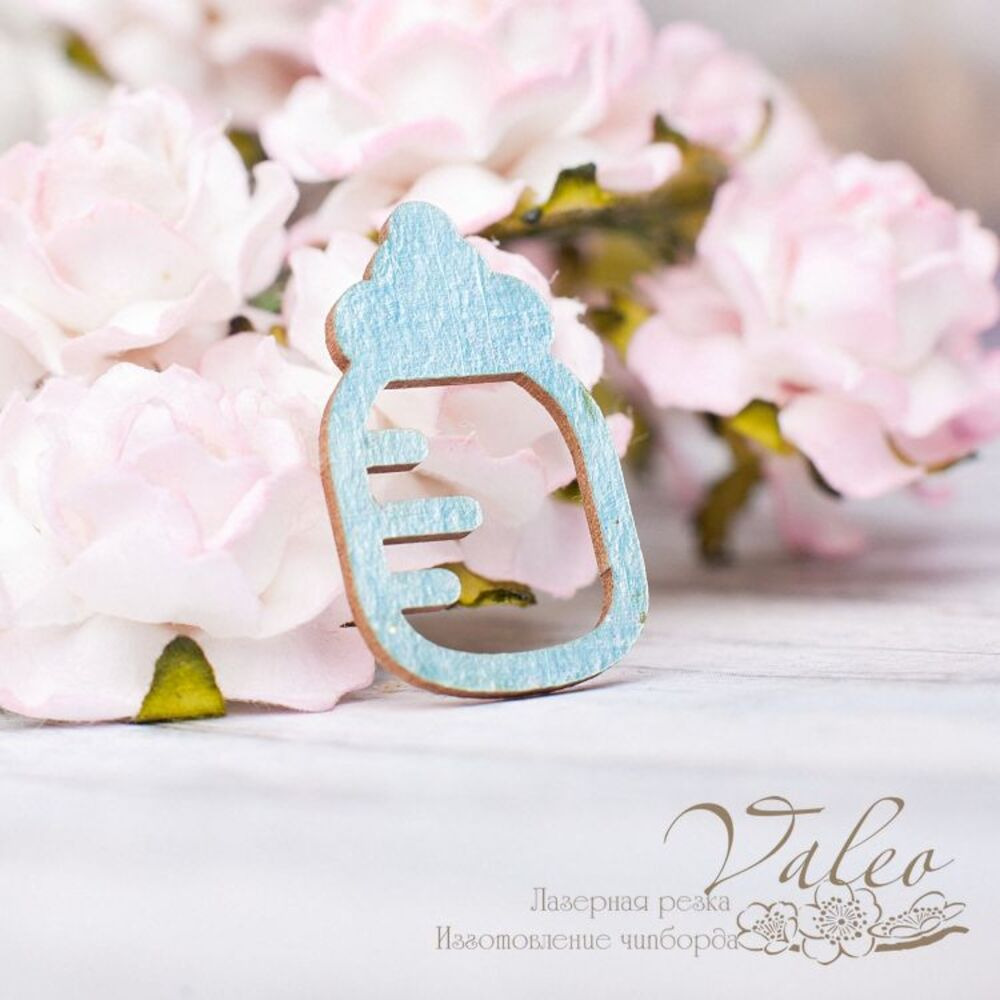 Чіпборд Valeo Пляшечка 18*29мм блакитний з глітером V2631 виготовлений із пивного картону молочного кольору. Товщина картону 1,5 мм. Краї чисті, світло-коричневі. Застосовується як декоративні елементи при виготовленні альбомів, листівок, запрошень