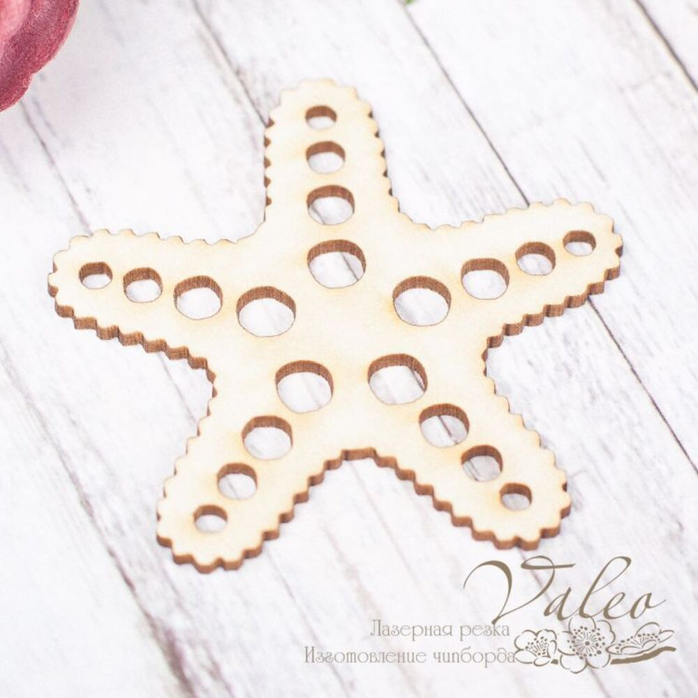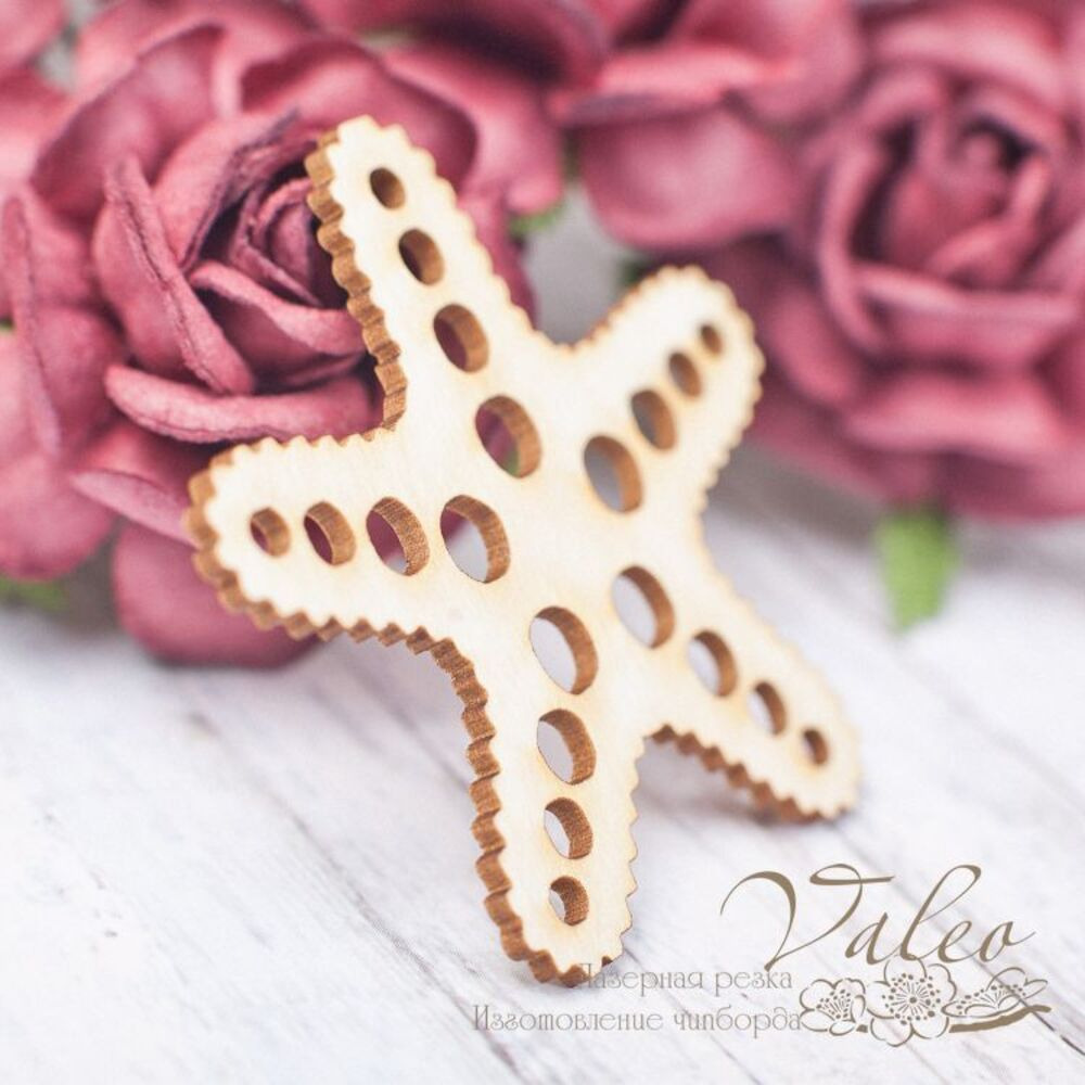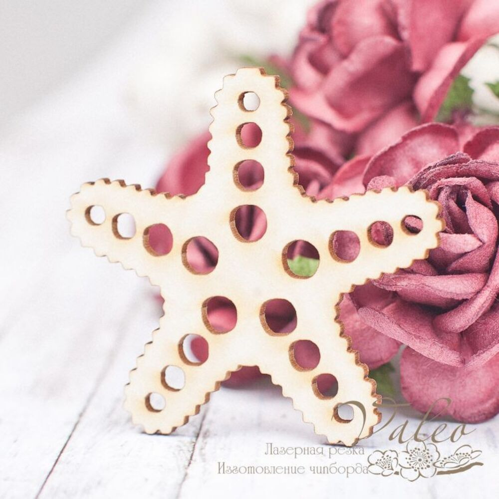 Чіпборд Valeo Морська зірка 45*43мм V1752 виготовлений із пивного картону молочного кольору. Товщина картону 1,5 мм. Краї чисті, світло-коричневі. Застосовується як декоративні елементи при виготовленні альбомів, листівок, запрошень