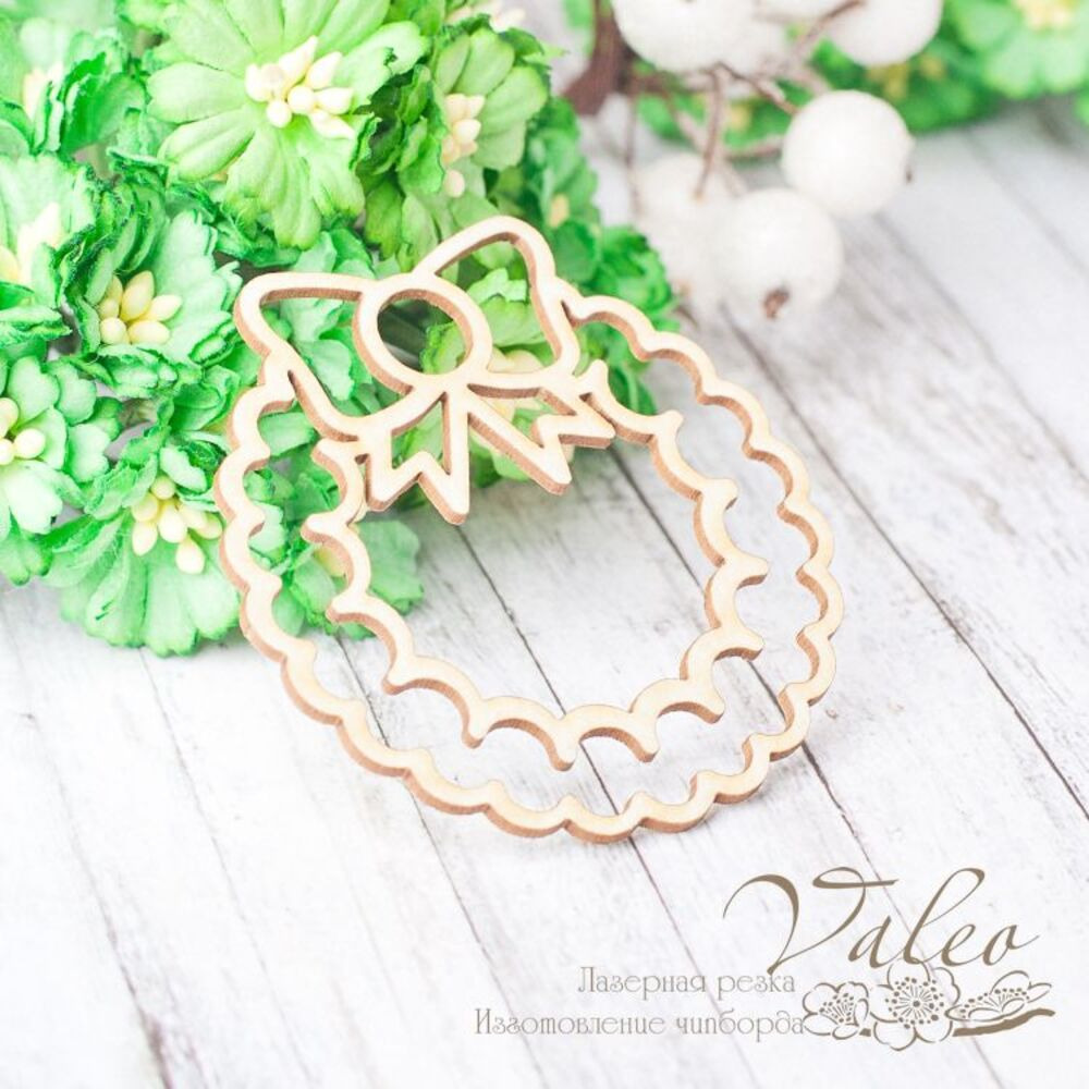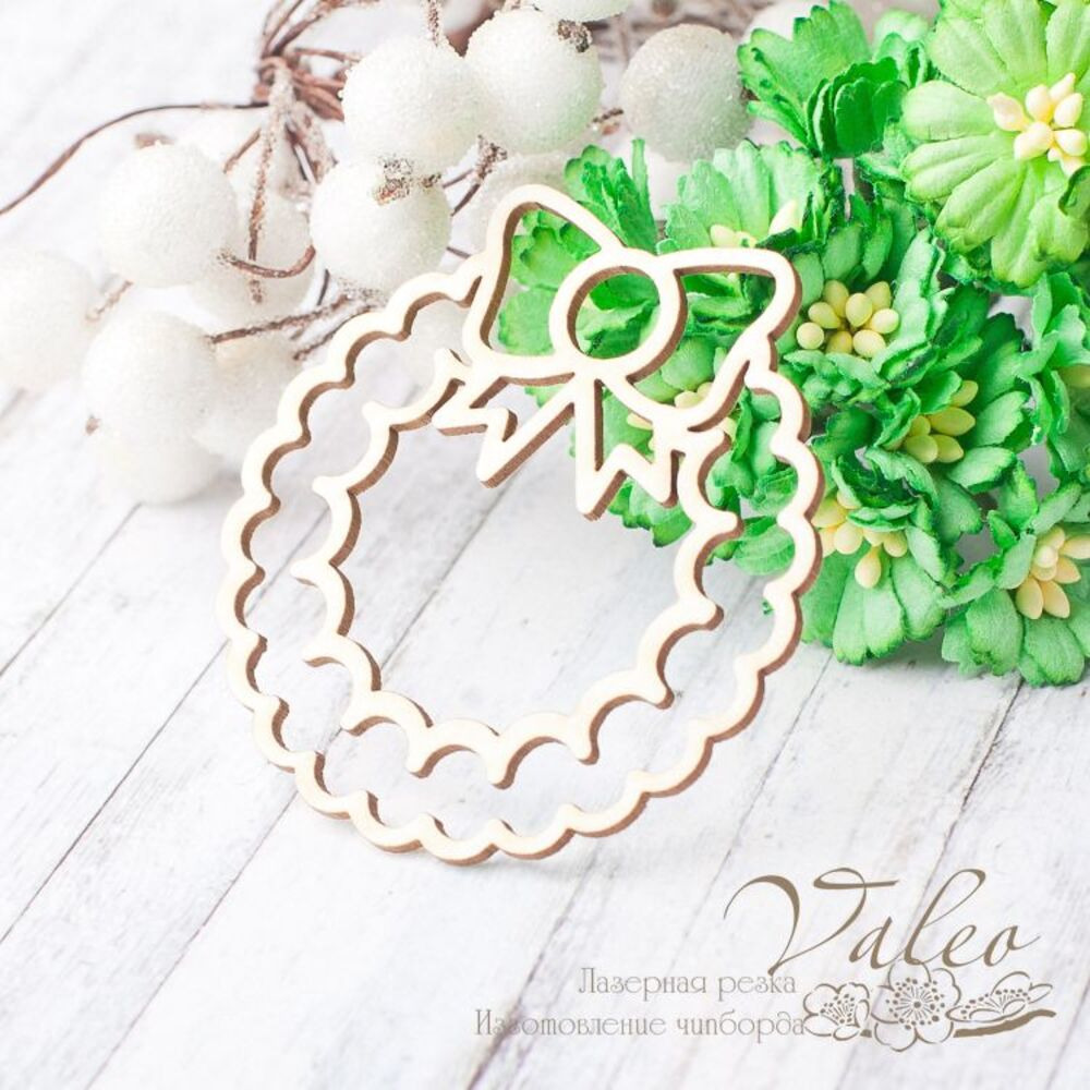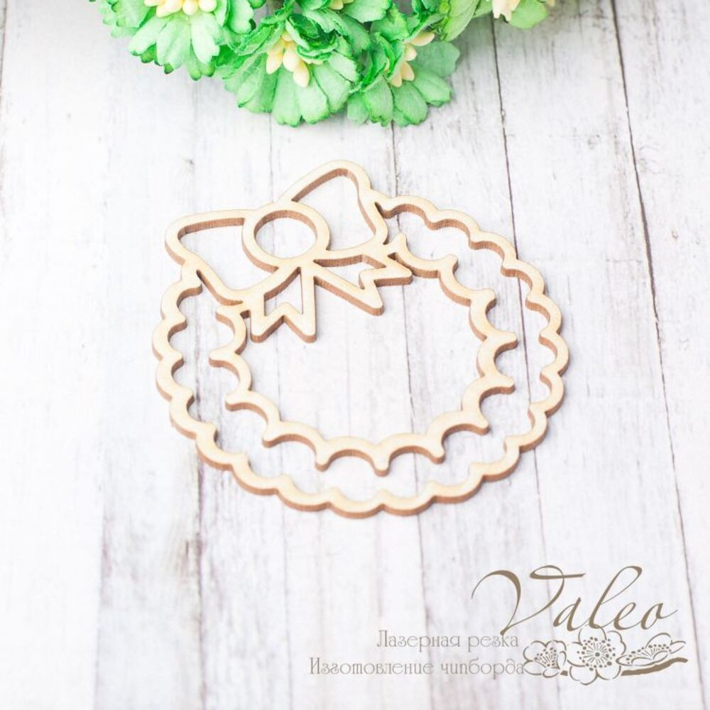 Чіпборд Valeo Новорічний вінок 55*57мм V2412 виготовлений із пивного картону молочного кольору. Товщина картону 1,5 мм. Краї чисті, світло-коричневі. Застосовується як декоративні елементи при виготовленні альбомів, листівок, запрошень