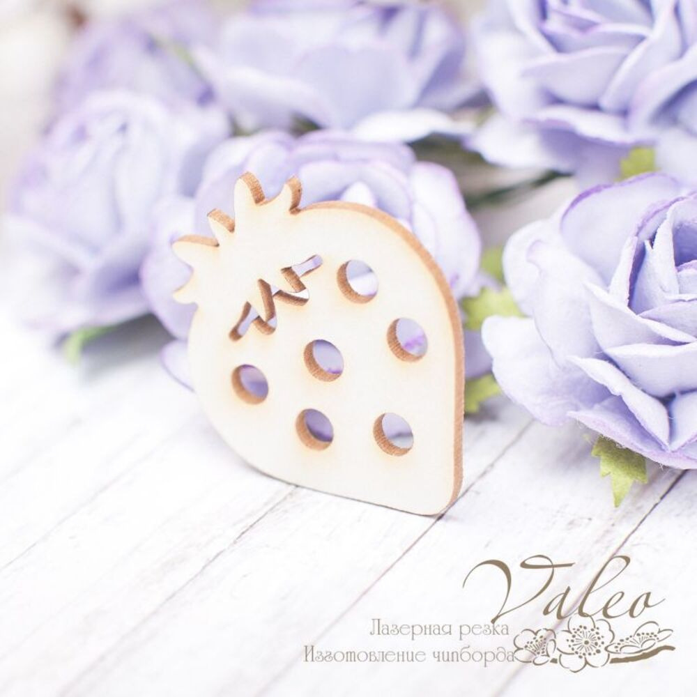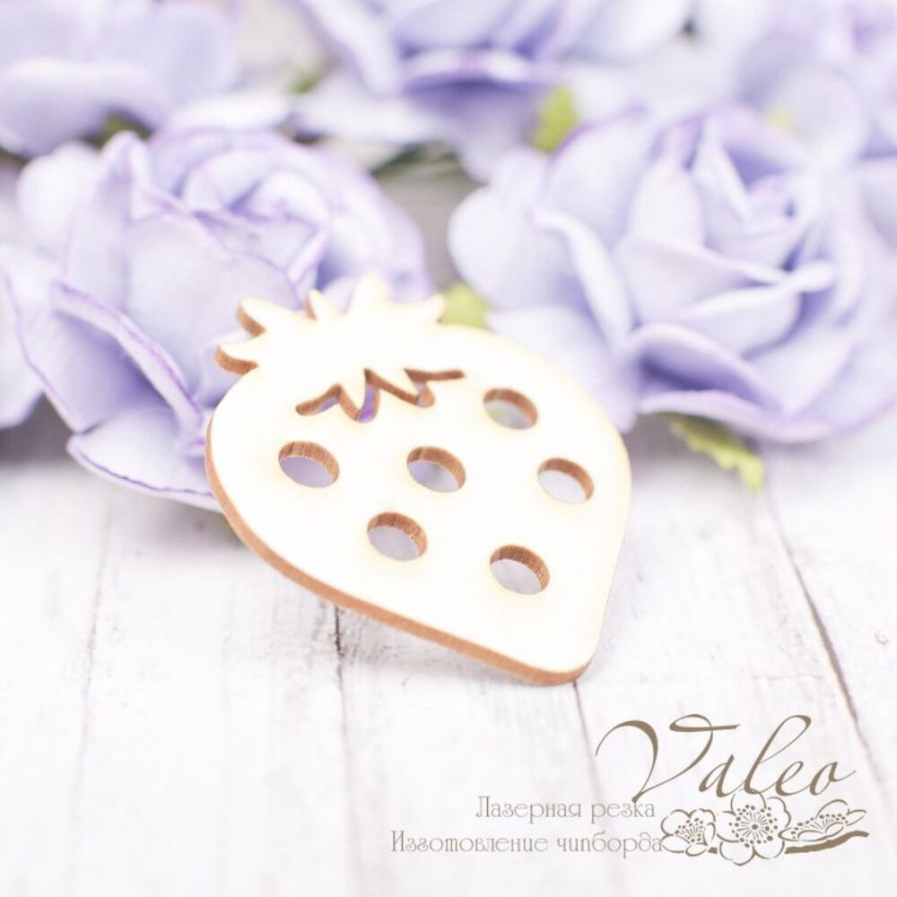 Чіпборд Valeo Полуничка 32*37мм V2161 виготовлений із пивного картону молочного кольору. Товщина картону 1,5 мм. Краї чисті, світло-коричневі. Застосовується як декоративні елементи при виготовленні альбомів, листівок, запрошень