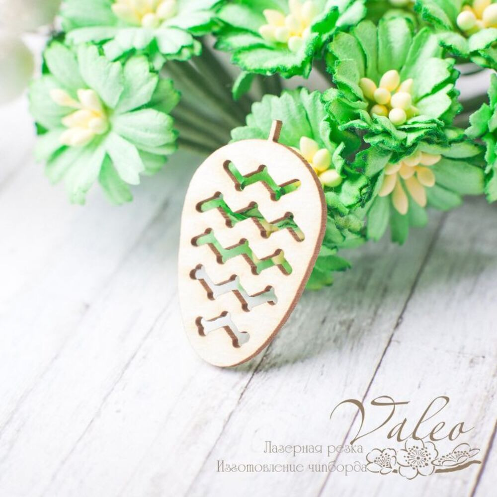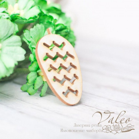 Чіпборд Valeo Шишка 20*34мм V2316 виготовлений із пивного картону молочного кольору. Товщина картону 1,5 мм. Краї чисті, світло-коричневі. Застосовується як декоративні елементи при виготовленні альбомів, листівок, запрошення