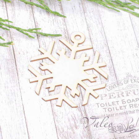 Чіпборд Valeo Сніжинка 57*65мм V1963 виготовлений із пивного картону молочного кольору. Товщина картону 1,5 мм. Краї чисті, світло-коричневі. Застосовується як декоративні елементи при виготовленні альбомів, листівок, запрошень