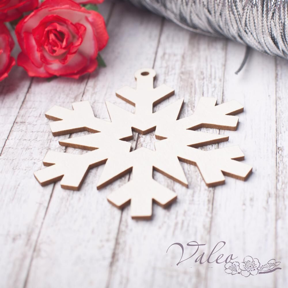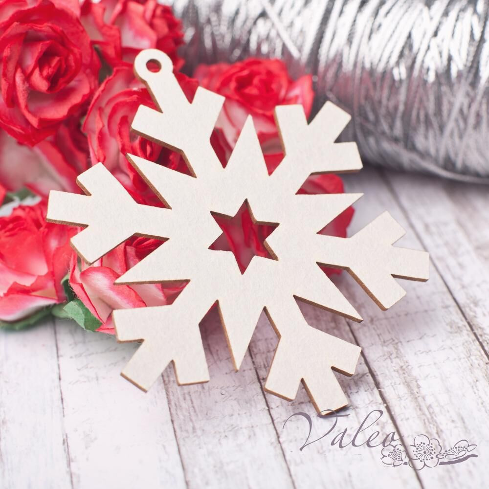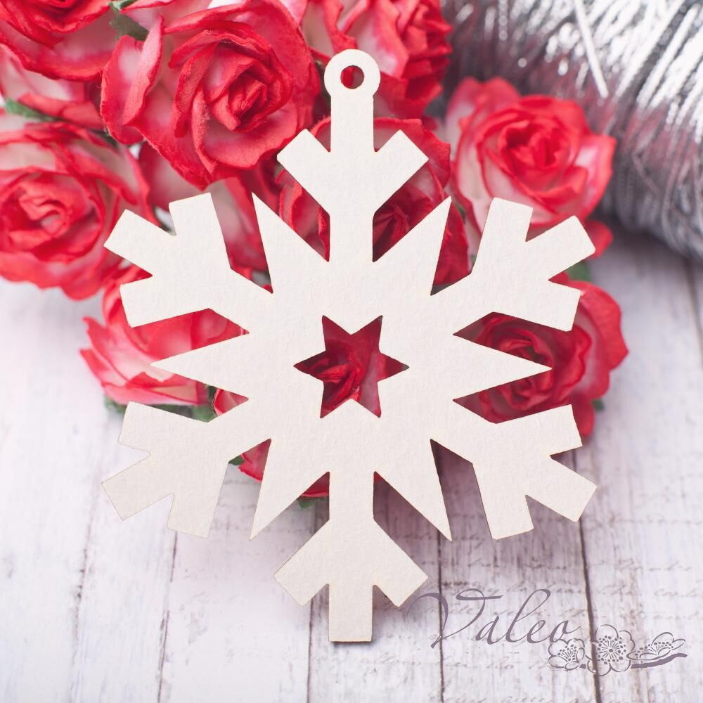 Чіпборд Valeo Сніжинка 65*64мм V2814 виготовлений із пивного картону молочного кольору. Товщина картону 1,5 мм. Краї чисті, світло-коричневі. Застосовується як декоративні елементи при виготовленні альбомів, листівок, запрошень