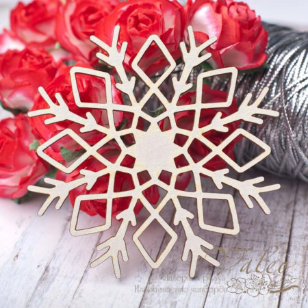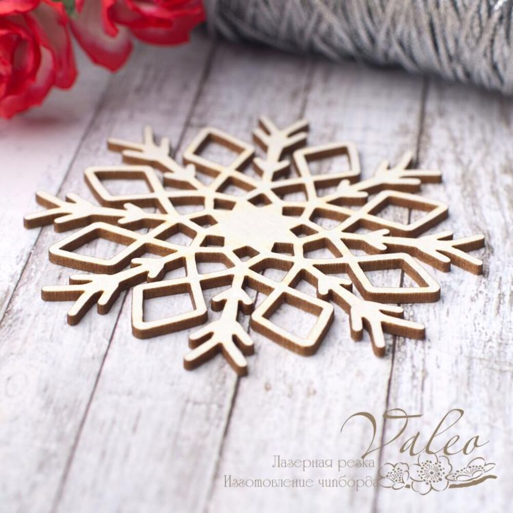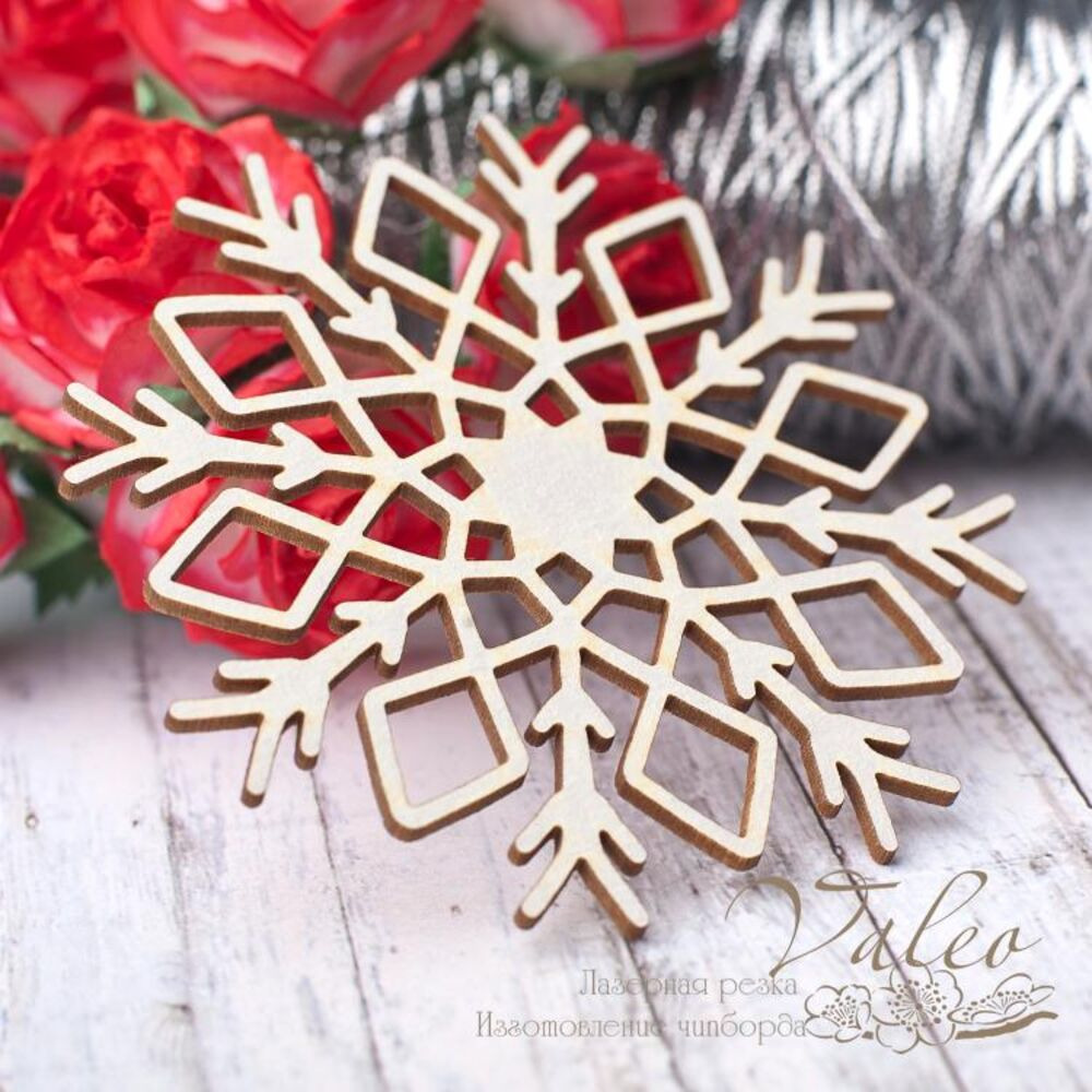 Чіпборд Valeo Сніжинка 65*65мм V2804 виготовлений із пивного картону молочного кольору. Товщина картону 1,5 мм. Краї чисті, світло-коричневі. Застосовується як декоративні елементи при виготовленні альбомів, листівок, запрошень