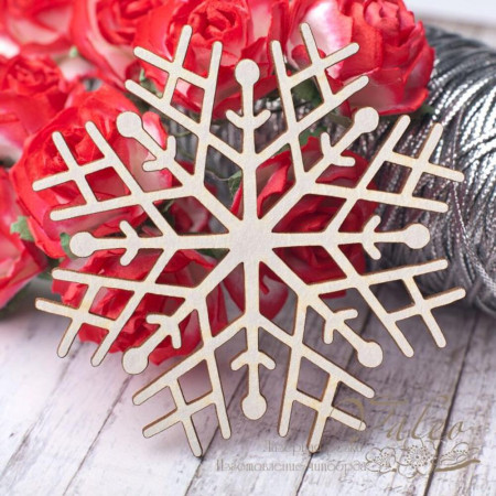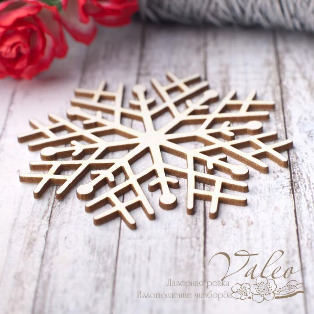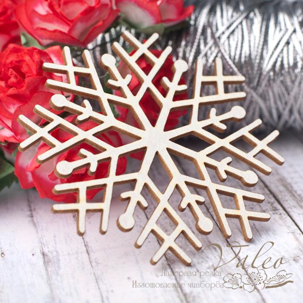 Чіпборд Valeo Сніжинка 66*66мм V2802 виготовлений із пивного картону молочного кольору. Товщина картону 1,5 мм. Краї чисті, світло-коричневі. Застосовується як декоративні елементи при виготовленні альбомів, листівок, запрошень