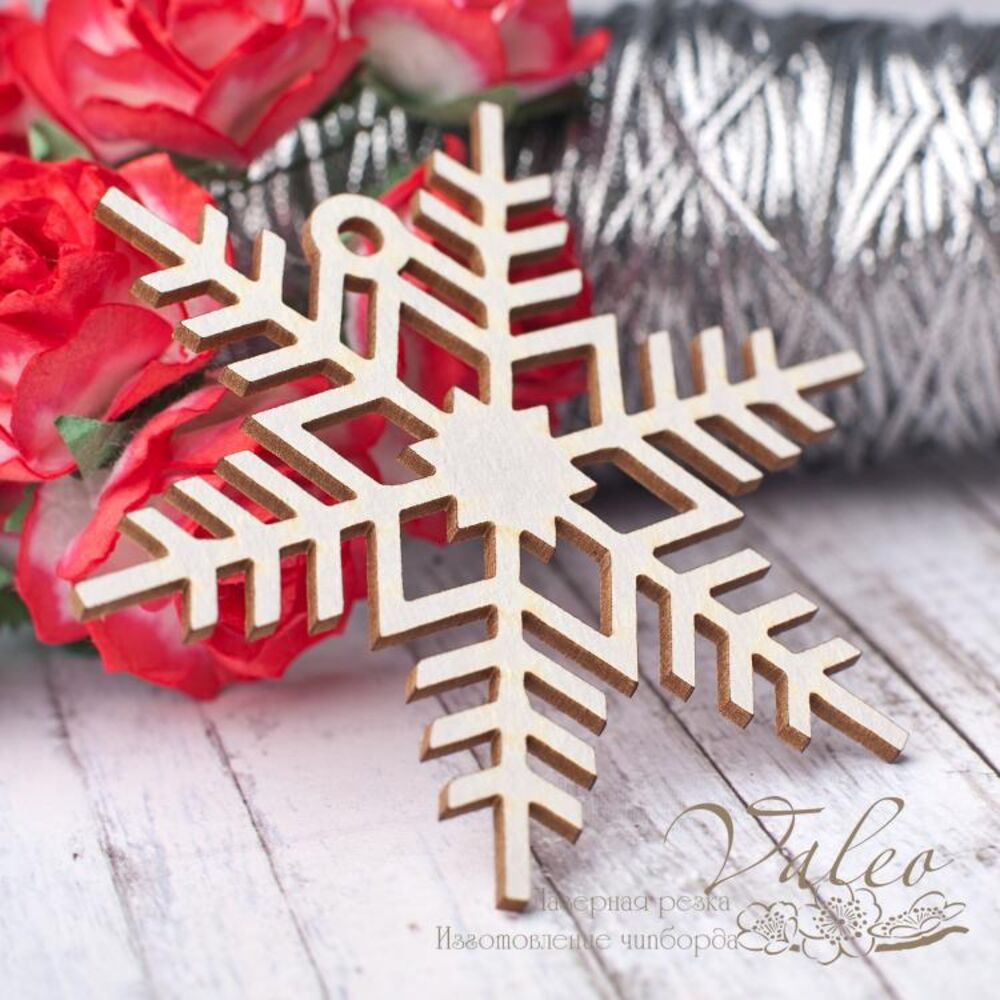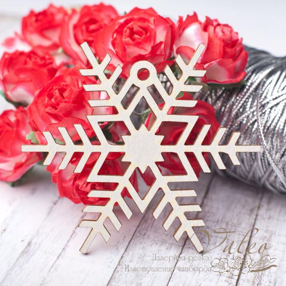 Чіпборд Valeo Сніжинка 69*60мм V2798 виготовлений із пивного картону молочного кольору. Товщина картону 1,5 мм. Краї чисті, світло-коричневі. Застосовується як декоративні елементи при виготовленні альбомів, листівок, запрошень