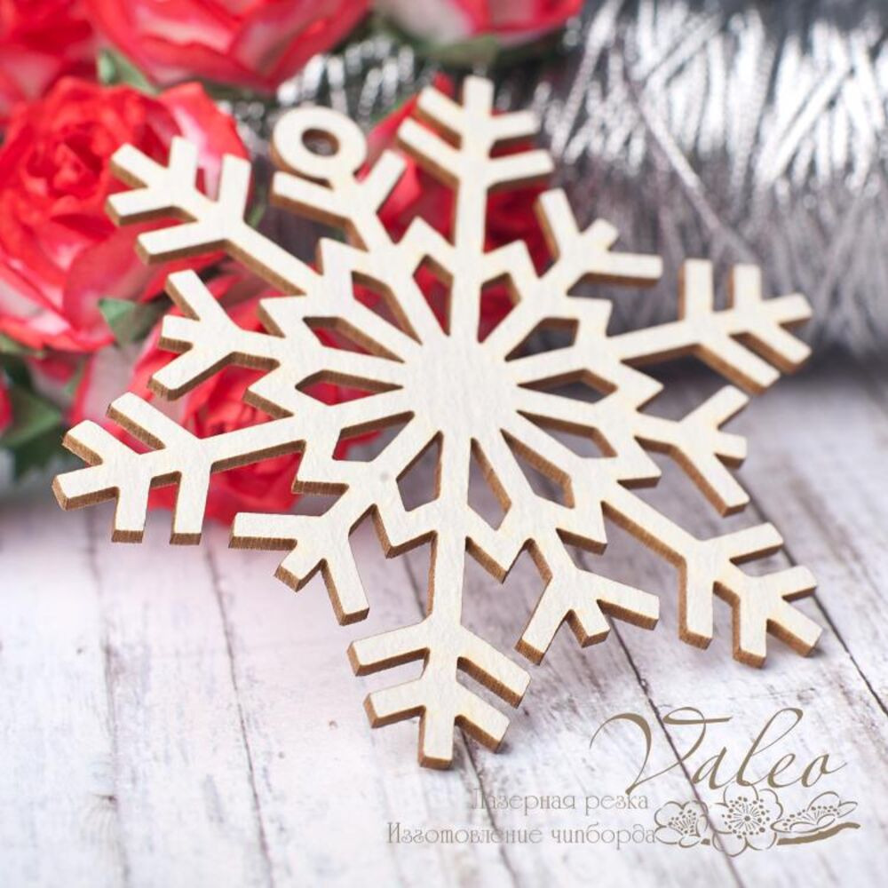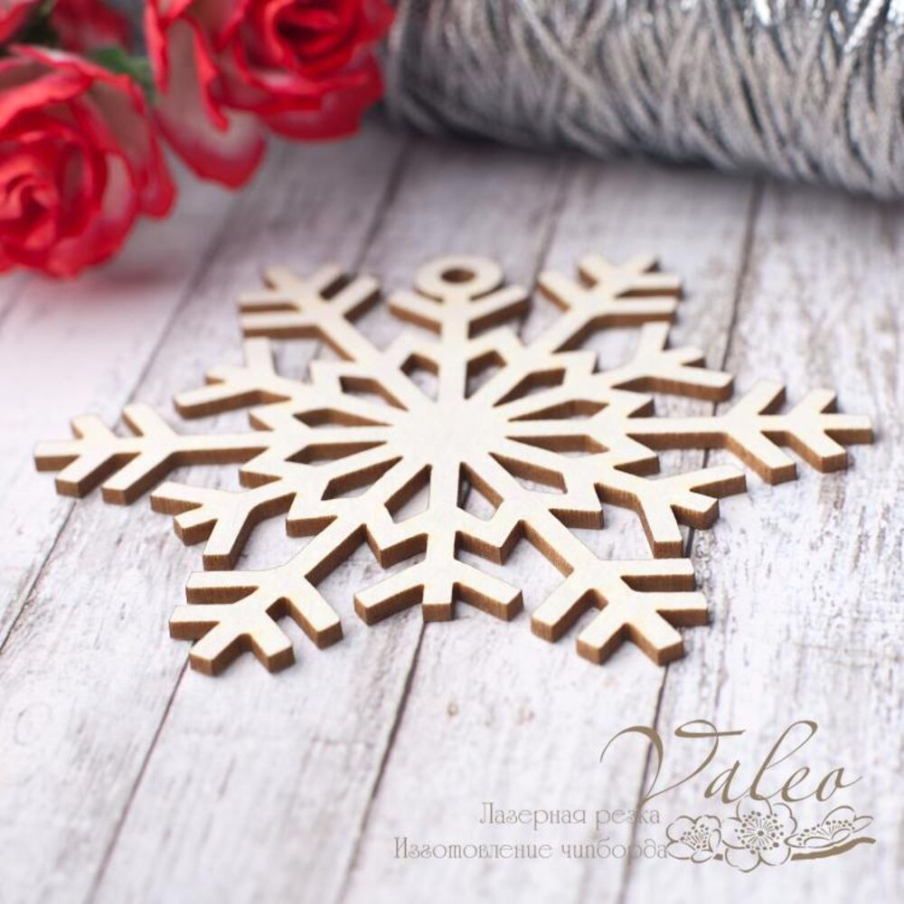 Чіпборд Valeo Сніжинка 71*72мм V2810 виготовлений із пивного картону молочного кольору. Товщина картону 1,5 мм. Краї чисті, світло-коричневі. Застосовується як декоративні елементи при виготовленні альбомів, листівок, запрошень