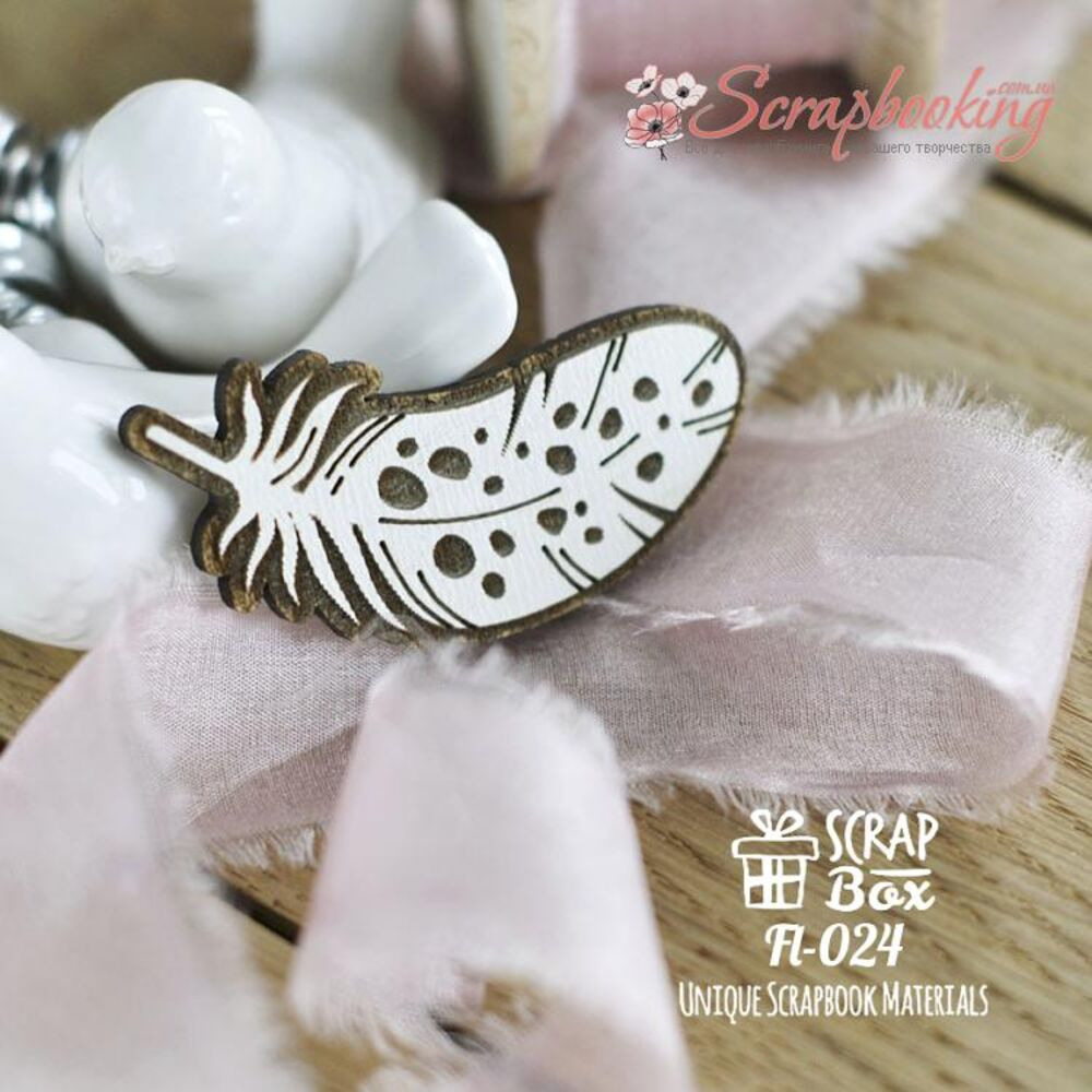 Дерев'яна фішка пір'янка перепілки виробника Scrapbox виготовлена з ДВП із нанесенням гравіювання. Товщина ДВП 3мм. Елементи виготовлені за допомогою лазерного різання. Чіпборди широко застосовуються в скрапбуку як декоративні елементи.