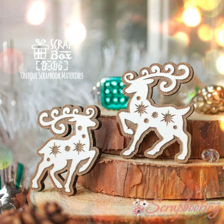 Деревянная фишка два оленя со звездами производителя Scrapbox изготовлен из ДВП толщины 3мм с нанесением гравировки. Элементы изготовлены с помощью лазерной резки. Деревянные фишки применяются в скрапбукинге в качестве декоративных элементов.