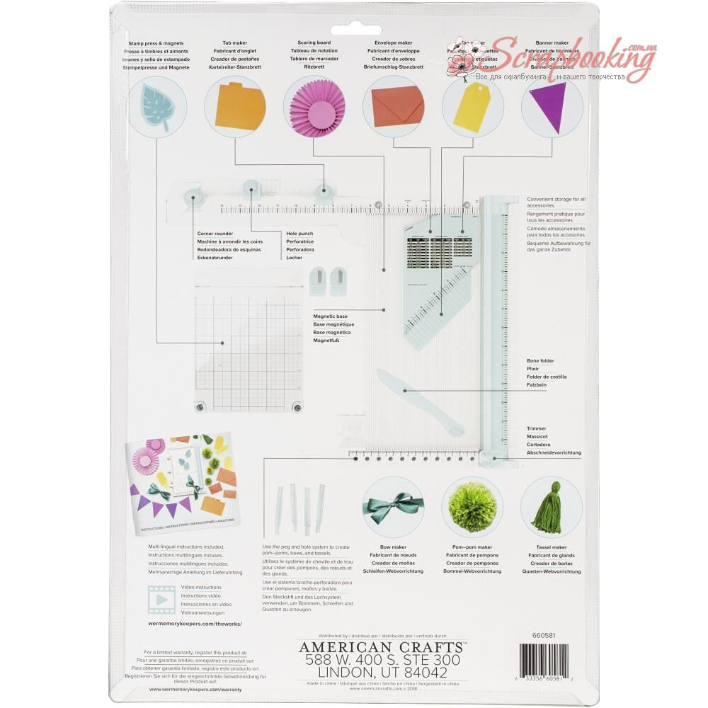 Універсальна дошка для скрапбукінгу We R Memory Keepers The Works All-In-One Tool застосовується для Штампінг, різання паперу, при виготовленні бантиків і помпонів. Включає в себе кілька інструментів: дошку для биговки, різак для паперу, прес для Штампінг, інструмент для виготовлення помпонів і бантиків. Повна комплектація містить: прес для Штампінг, магніти (2шт), багатофункціональна дошка, кутник для биговки, інструмент для біговки, кілочки для виготовлення помпонів і бантиків в кількості 4 шт.